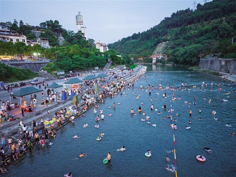 8月7日,吉首市首个利用自然河道改建的天然浴场营庄社区滨河浴场建成开放。浴场划分浅水区、深水区、危险区,提供停车场、更衣间、遮阳棚和警示提醒、安全救援等配套服务,为群众提供安全、干净、舒适的游泳区域。 团结报全媒体记者 张谨 摄