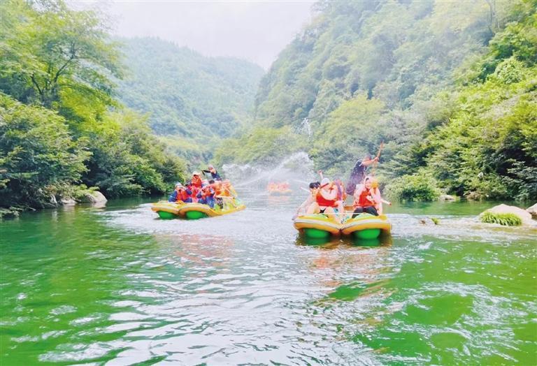 近日,游客在永顺县猛洞河景区漂流、打水仗,尽情享受清凉。连日来,湘西州持续高温天气,猛洞河景区漂流迎来客流高峰,不少游客来此激情冲浪、惬意泛舟,戏水消暑。 团结报全媒体记者 李再兴 通讯员 王璇 摄