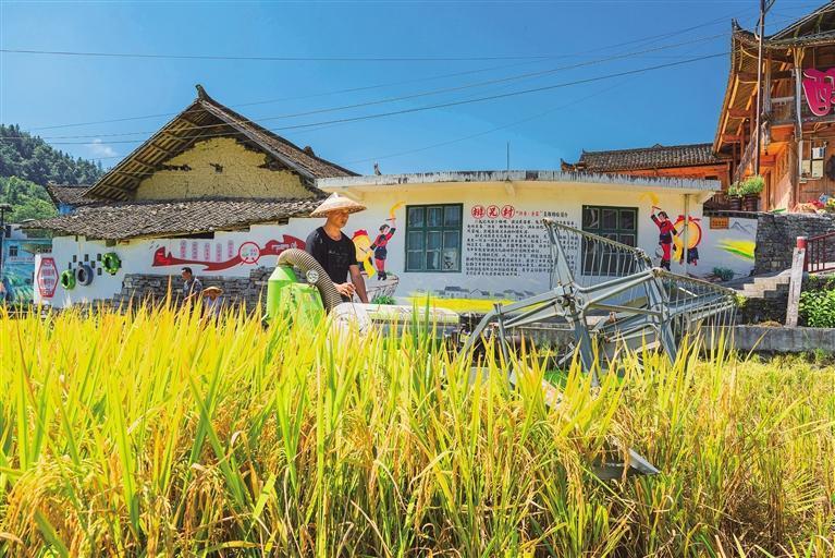 8月21日,吉首市矮寨镇排兄村苗寨,优质水稻“玉针香”进入收割期,村民抢抓晴好天气,运用小型收割机进行收割,确保颗粒归仓。 梁永鸿 摄