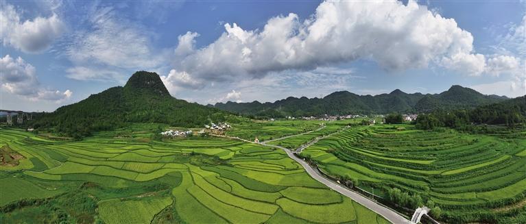 夏末,花垣县麻栗场镇沙科村水稻长势喜人。相传清朝举人石板塘来到此地,看见一座“尖岩山”如笔直插云霄,便出了“尖山似笔,倒写蓝天一张纸”的上联,引来众多文人墨客应对下联。此地也因“尖山”而闻名。 团结报全媒体记者 张谨 摄