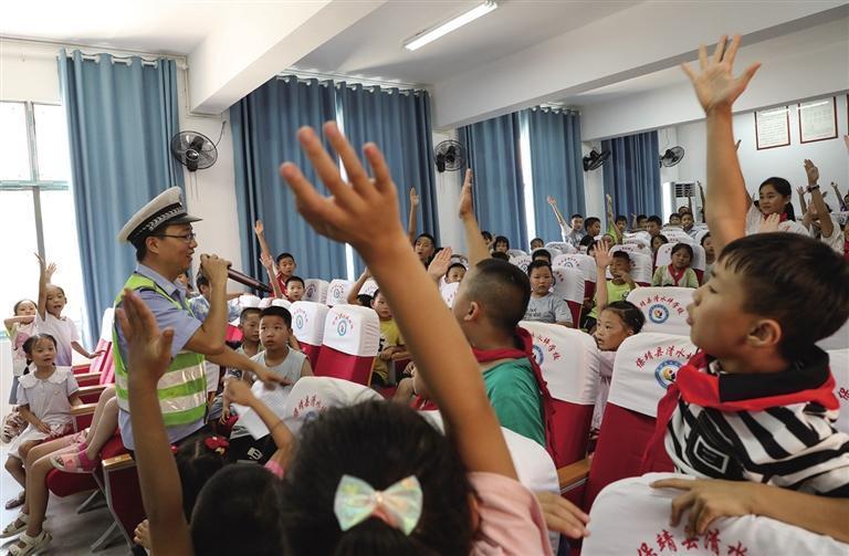 9月2日,保靖县清水坪学校,该县公安局交警大队民警在给学生普及交通安全知识,增强孩子们的交通安全意识和自我保护能力。 俞采华 龚娟 摄