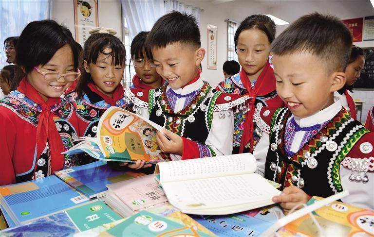 9月2日,吉首市寨阳小学学生开心地领到新课本。当天是该市中小学秋季开学第一天,学生们走进温馨的校园,喜领新课本迎接新学期。 姚方 杨燕萍 摄
