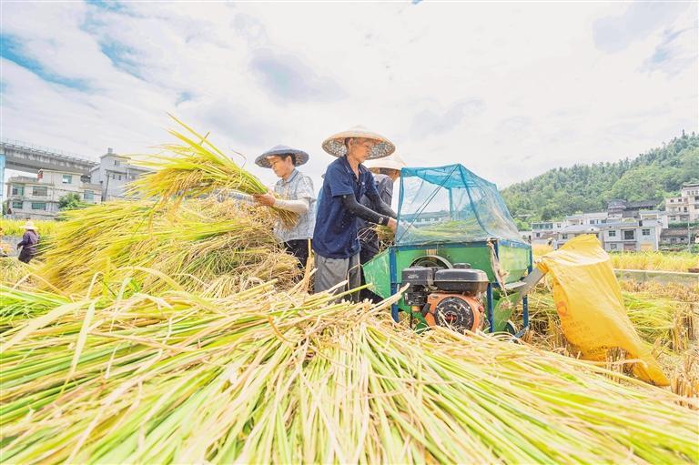 8月29日,吉首市矮寨镇幸福村,村民抢晴好天气收割水稻,一派丰收景象。 梁永鸿 摄