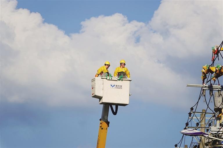 7月23日,龙山县城朝阳路,国网龙山县供电公司带电作业人员顶着39℃以上的高温,带电处理10千伏宝朝线开关缺陷,确保电网安全稳定运行。 田良东 摄