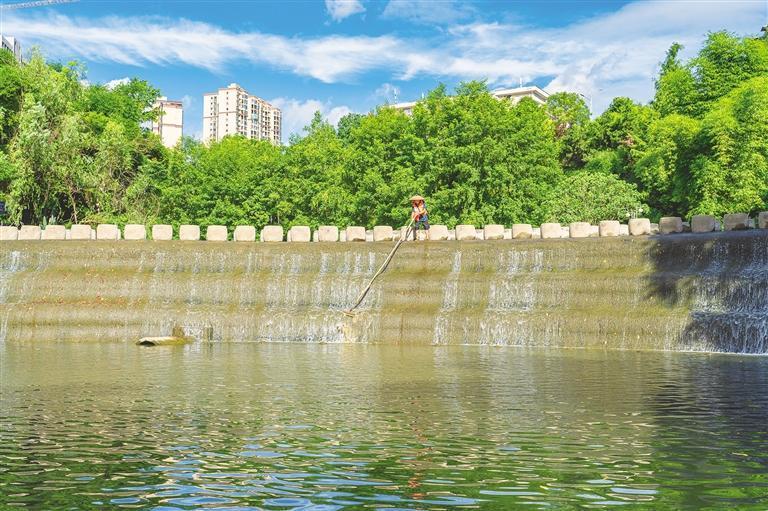 7月19日,湘西高新区湾溪河,环卫工人冒着酷暑高温,在水坝清除淤积的杂物垃圾。 梁永鸿 摄