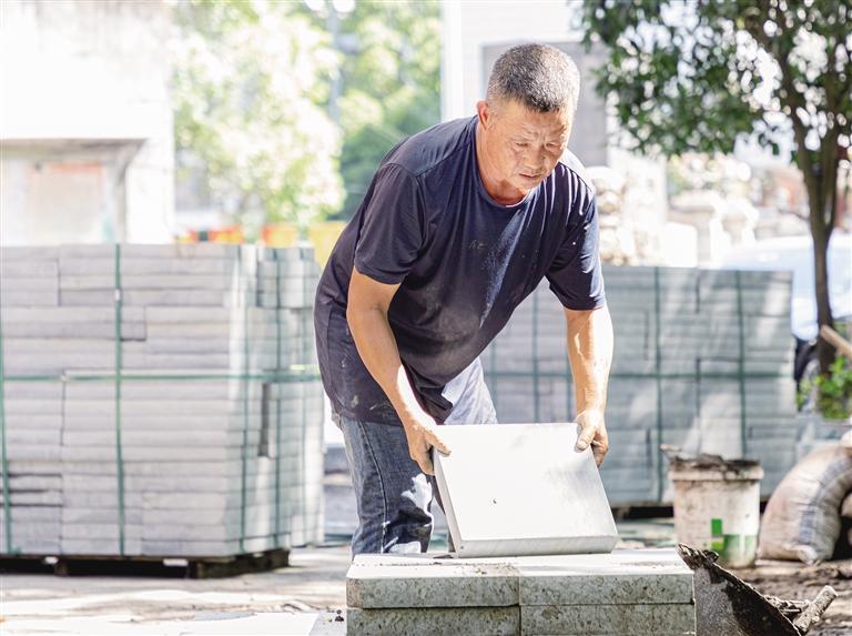 8月6日,泸溪县武溪镇白沙社区株洲南路,施工人员挥汗如雨在铺修人行道路。 覃仁岗 摄