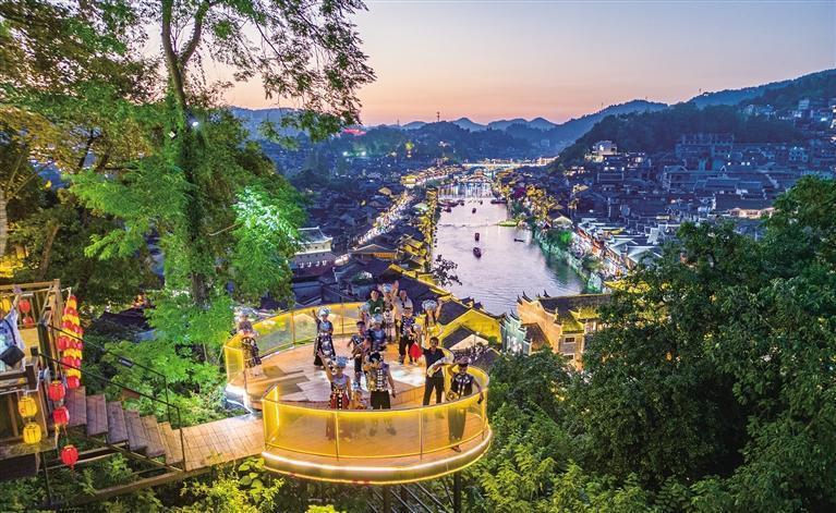 8月21日,凤凰古城南华山风景区的凤凰之心观景台上,游客身着苗族盛装拍照打卡。从此处,游客可眺码头跳岩、观沙湾烟火、赏沱江蜿蜒,尽揽一城美景。 团结报全媒体记者 张谨 摄