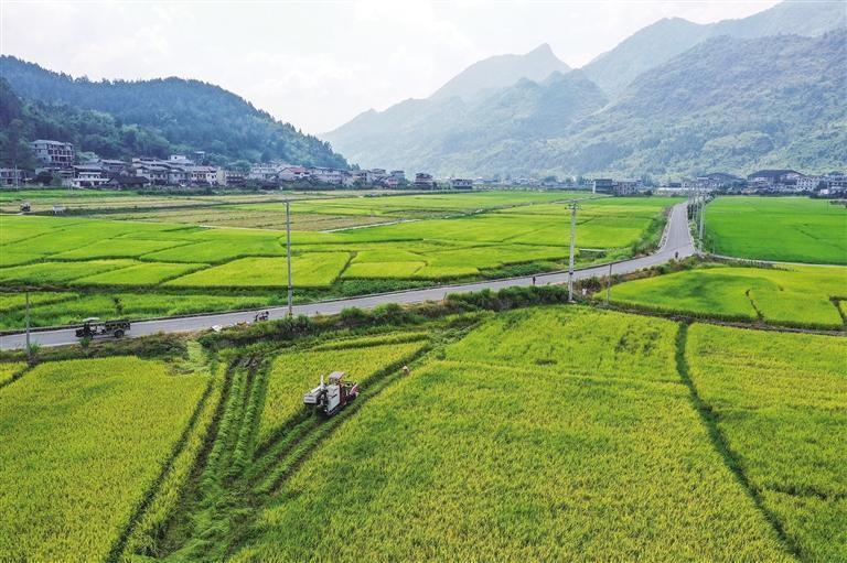 9月3日,龙山县苗儿滩镇黎明村,水稻成熟,田间收割机不断穿梭,一幅丰收好图景。曾祥辉 摄