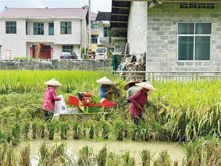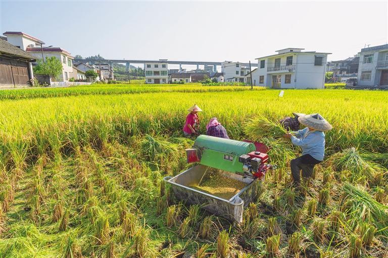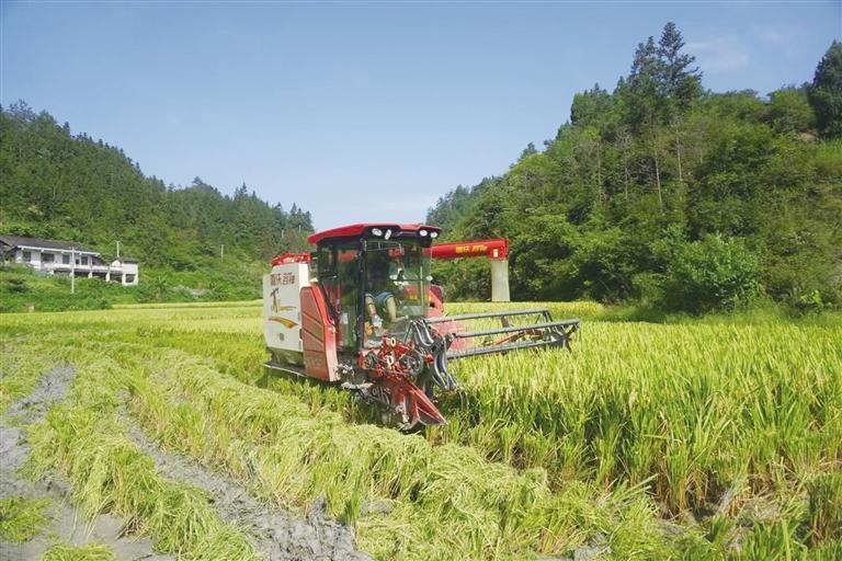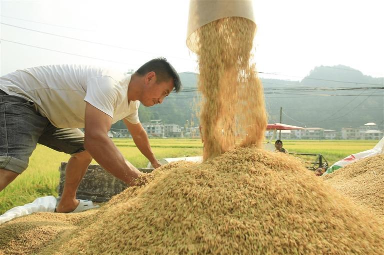 近日,吉首市矮寨镇排兄村,村民们抢抓晴好天气,利用农机具抓紧收割稻谷,确保粮食颗粒归仓。 梁永鸿 摄