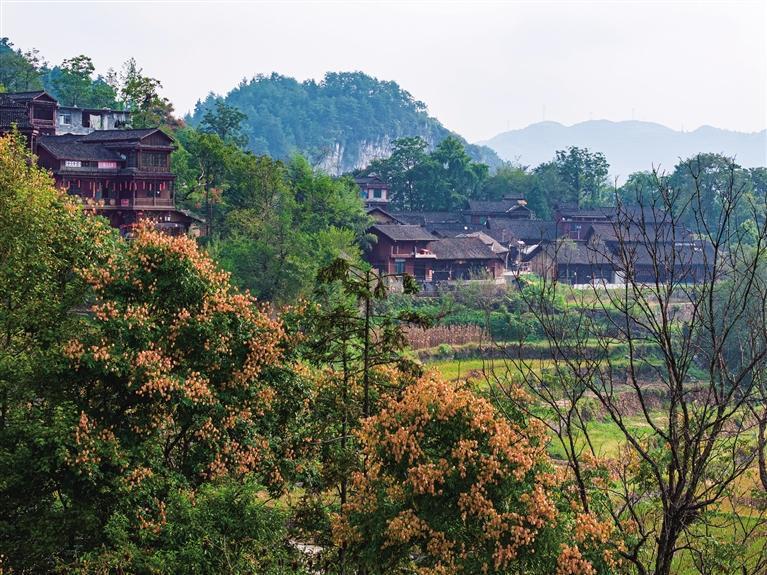 入秋后,湘西大地秋色浓郁,吉首市矮寨镇吉斗苗寨被五彩缤纷的树木环绕,炊烟袅袅,宛如一幅田园油画。 团结报全媒体记者 张谨 摄