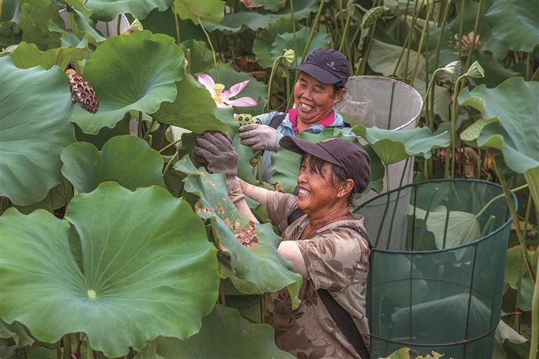 近日,泸溪县浦市镇万荷园里,兰祺合作社工人正在采收莲子。该合作社2022年承包万荷园中心景区450 亩荷塘,开展荷花种植,每年采收莲子6万多公斤,年均产值百余万元,助力群众增收致富。 张克宁 摄