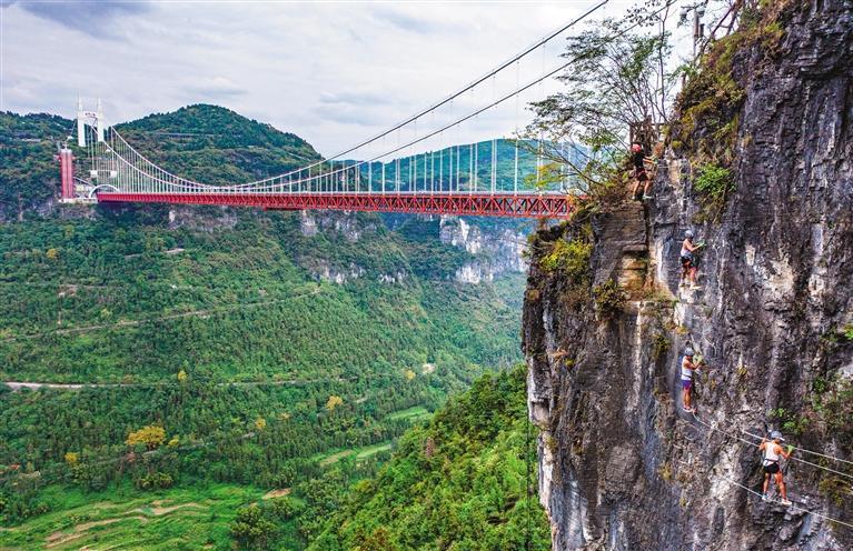 9月22日,2024湘西矮寨大桥“高空铁三”挑战赛在矮寨奇观旅游区炫酷开赛,来自全国各地的300余名选手参赛。比赛分为高空漫步、高空矩阵、飞拉达共3个项目,图为飞拉达项目进行中,参赛选手在绝壁上攀缘。不远处,德夯大峡谷、矮寨大桥和古老的苗寨交相呼应。团结报见习记者 胡承鼎 摄