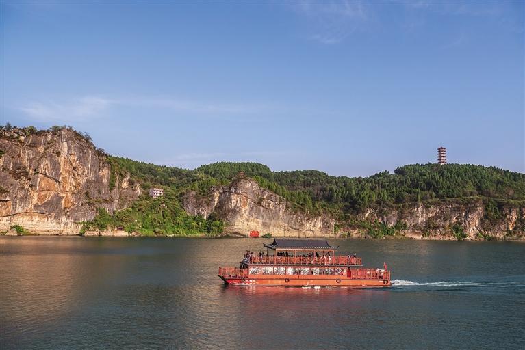 国庆假期,来自全国各地的游客来到泸溪县的沅江十里画壁,乘坐沅水明珠号游轮领略十里画壁的自然美景。 张克宁 摄