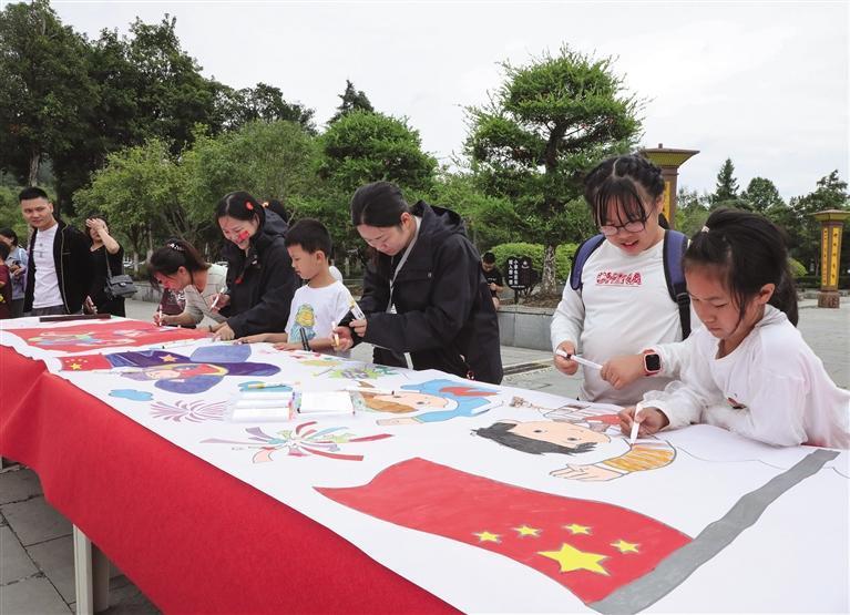 10月2日,龙山县里耶古城(秦简)博物馆,游客在进行“长卷庆国庆 童心绘祖国”主题绘画,表达对祖国的热爱与祝福。 俞采华 周金标 摄