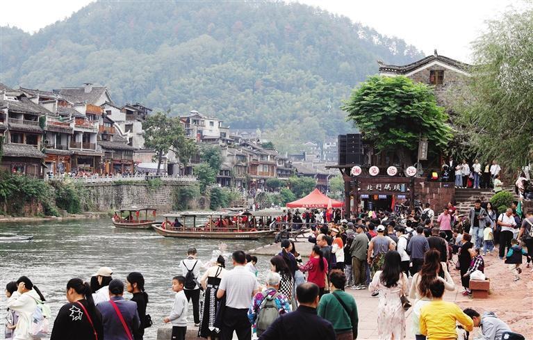 10月5日,凤凰古城,众多游客在沱江泛舟,观美景、品民俗,乐享国庆假期。 滕建康 摄
