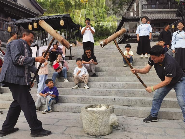 10月4日,游客在花垣县边城茶峒景区体验打糍粑。国庆长假期间,边城茶峒景区迎来旅游高峰,景区推出水上集市、翠翠巡游等一系列丰富多彩的主题活动,激发游客参与热情,提升游客体验感。 团结报全媒体记者 龙莹 摄