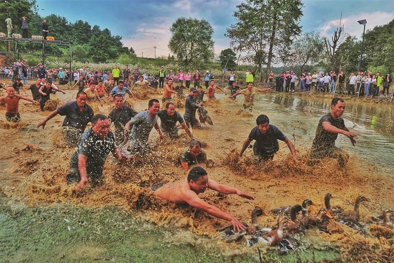 10月10日,凤凰县腊尔山镇夯卡村举行“迎重阳 庆丰收”活动。村民们抓鱼捉鸭,现场热闹非凡。游客们纷纷驻足观看,近距离体验苗家传统民俗乐趣,感受原汁原味的苗族重阳节文化盛宴。 蒋文杰 胡湘玉 摄
