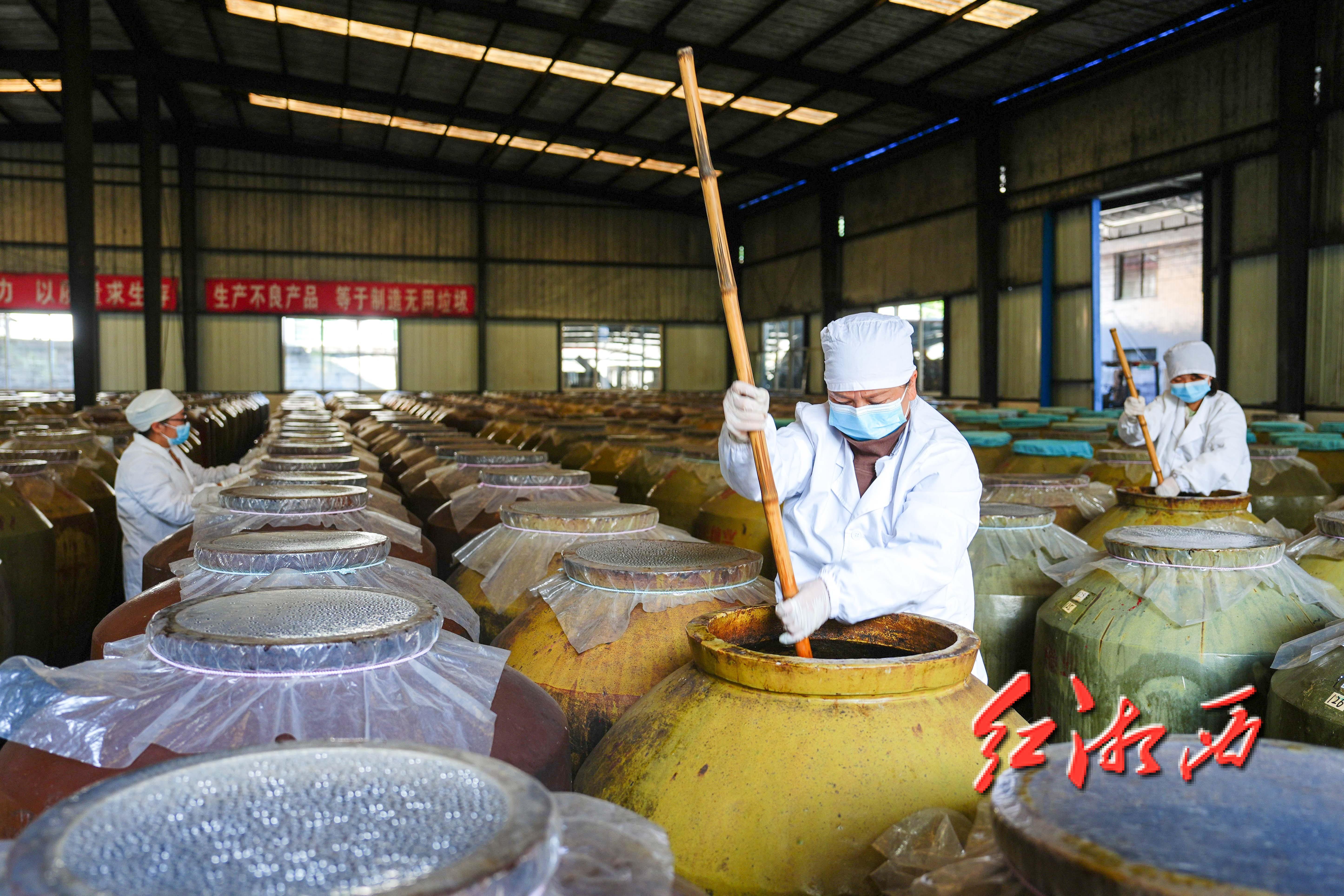 工人们正在厂房内搅拌发酵原材料。