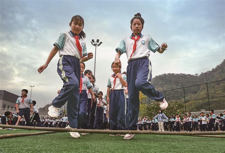 11月12日,吉首市乾雅小学校园,师生在课间快乐地跳竹竿舞。该校将非遗项目与体育大课间融合,创编成校园广播体操,打造别具一格的群体体育课,让师生感受传统文化魅力,在运动中强健体魄、愉悦身心。 姚方 吴拥华 摄