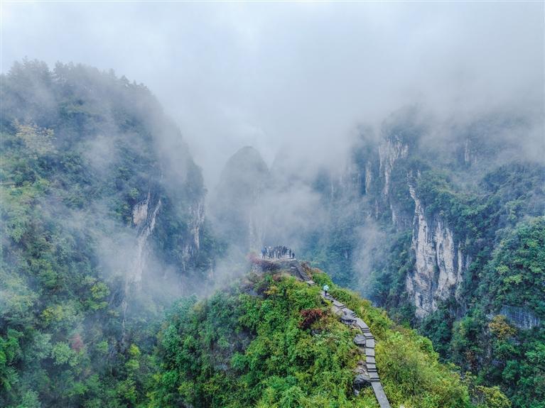 11月24日,烟雨中的吉首市矮寨奇观旅游区天问台云雾缭绕,美不胜收,游客身在其中,宛如画中游。