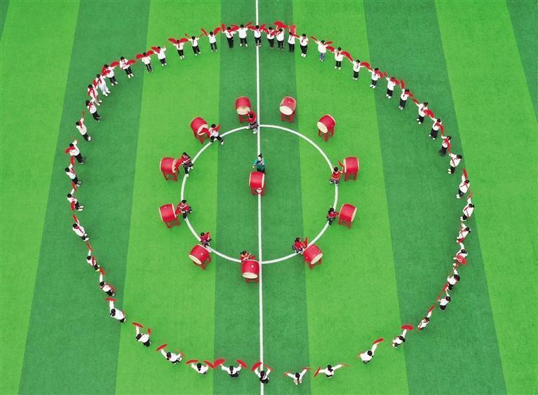 12月3日,花垣县龙潭镇中心小学,学生在大课间进行打苗鼓、跳扇子舞等活动。该校将苗族鼓舞、苗族武术、苗族扇子舞等非遗文化引进大课间,丰富校园文化生活。 龙恩泽 摄