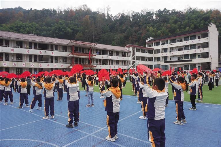 12月2日,永顺县灵溪镇吊井九年制学校师生在跳扇子舞。近年来,该县中小学校大力弘扬和传承民族文化,积极开展形式活泼多样、内容丰富多彩的艺术大课间活动,让校园朝气蓬勃。 吴华 摄