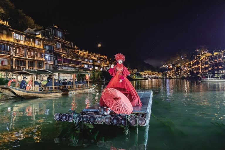 近日,游客们泛舟凤凰古城沱江,体验“湘见·沱江”沉浸式游船夜游项目,感受醉人的沱江风情,领略“一座青山抱古城,一弯沱江绕城过”的绝美风光。凤凰县不断提升软硬件建设和管理服务水平,着力打造夜游项目,助推全域文旅高质量发展。