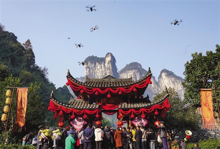 12月28日,“神秘湘西过大年”冬游湘西消费季活动启动仪式在吉首市矮寨镇德夯苗寨举行。嘉宾与群众参加拦门酒活动,天空中的无人机寻找最佳角度拍摄盛况。 团结报报全媒体记者 张谨 摄