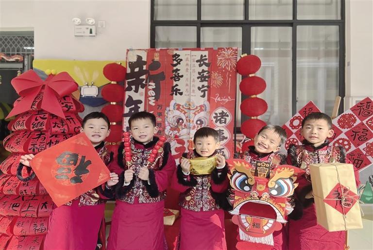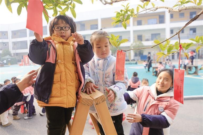 2024年12月30日,龙山县第一幼儿园组织小朋友开展丰富多彩的活动,迎接2025年的到来。图为小朋友将新年祝福挂在树上。 曾祥辉 常捷 摄