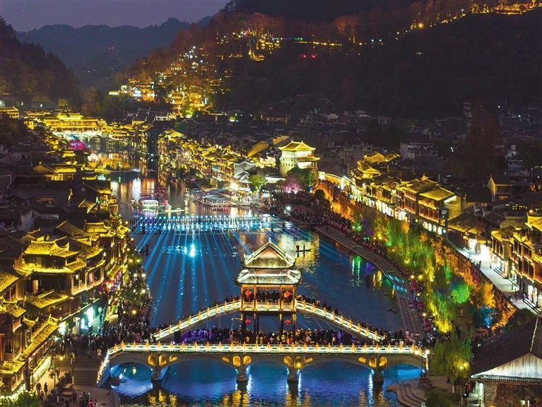 1月1日,“光影盛宴·梦回凤凰”元旦节凤凰古城启灯仪式暨民俗展演启幕。光影交织的盛景里,来自天南地北的游客在灯火辉煌中祈福新年。 团结报全媒休记者 张谨 摄