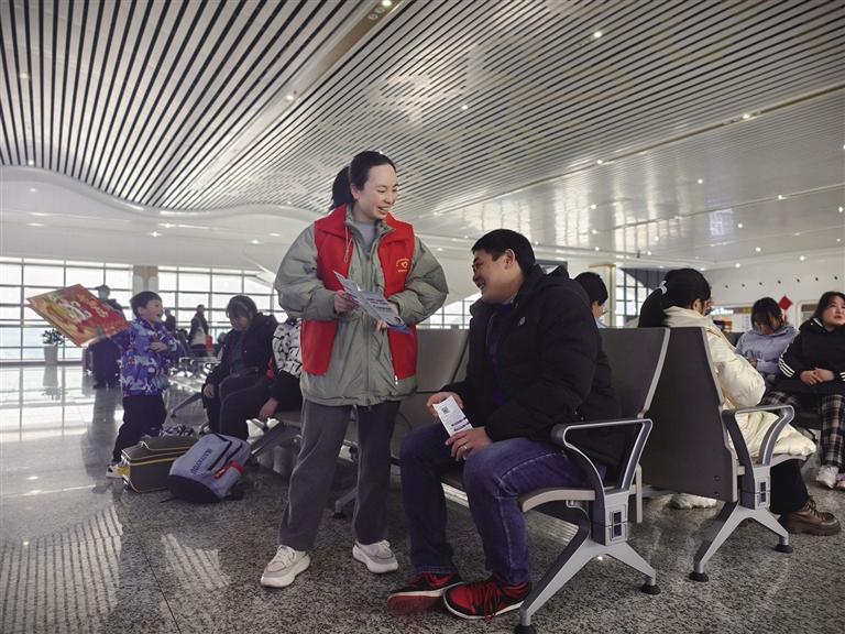 1月14日,湘西州交通运输局志愿者在吉首东站向市民发放春运宣传资料。春运开启,该局组织开展“青春志愿行 温暖回家路”春运志愿者服务活动,在吉首东站、吉首汽车北站、吉首汽车西站为旅客提供票务协作、候车引导、行李搬运等服务,宣传交通安全知识,护航春运。 团结报全媒体记者 麻垣杰 摄