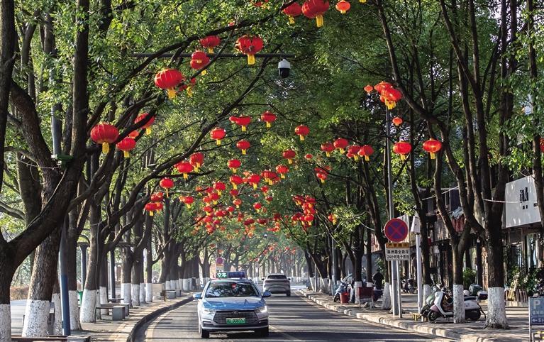 1月16日,泸溪县城白沙绿荫道挂满了红色灯笼,增添节日气氛,迎接新春到来。 覃仁岗 摄