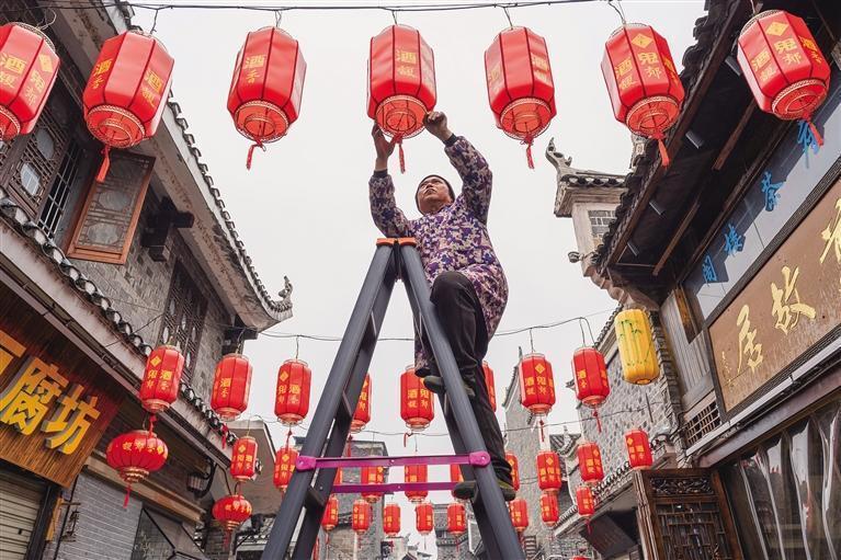 1月22日,吉首市乾州古城,工人在换新红灯笼,布置迎年设施,为市民和游客营造喜庆的浓浓年味。 梁永鸿 摄