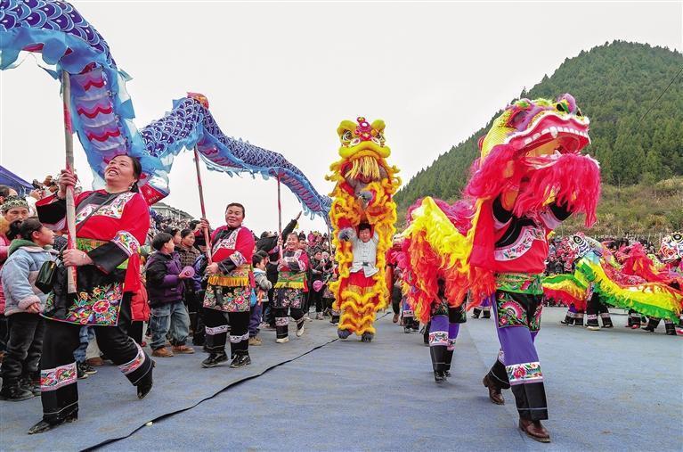2月3日,花垣县龙潭镇双坪村文化广场,村民在表演舞龙舞狮。春节期间,该县组织举办苗鼓苗歌比赛、舞龙舞狮、广场舞表演等丰富多彩的民俗文化活动,营造凝心聚力、文明健康、喜庆祥和的节日氛围。 龙艾青 摄