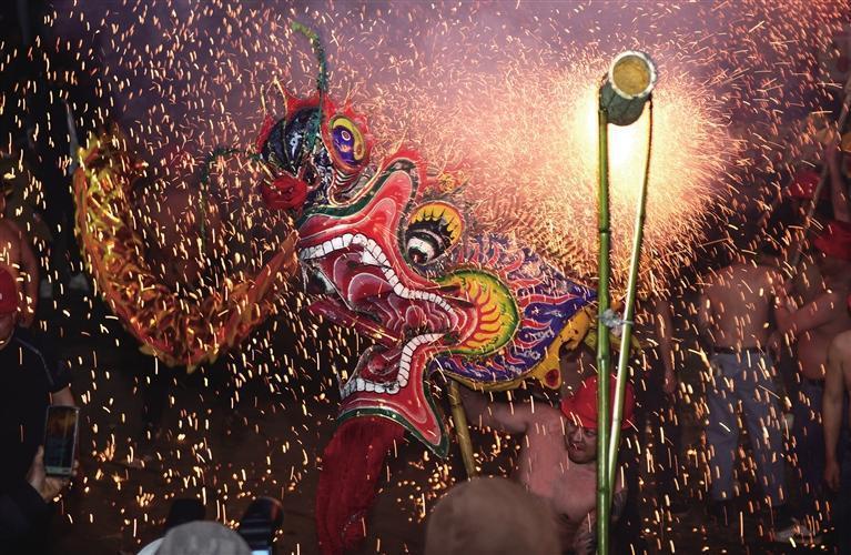 2月10日晚,吉首市马颈坳镇溪马村举行传统民俗钢火烧龙闹元宵巡游活动,彩龙飞舞,“钢花”绽放,吸引众多市民游客前来观赏。 姚方 杨燕萍 摄