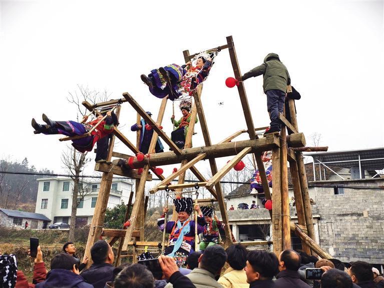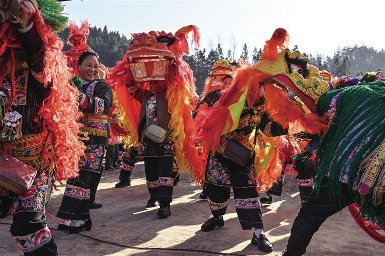 2月9日,花垣县双龙镇红英村,村民欢聚一堂,舞龙舞狮、打苗鼓、唱苗歌,喜迎元宵佳节。 龙恩泽 摄