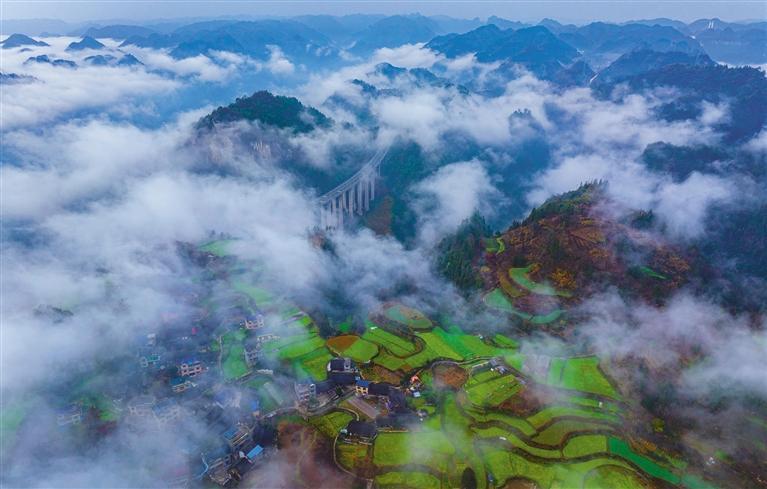 近日,雨后初晴的清晨,吉首市石家冲街道庄稼村周边云雾氤氲,仿若仙境。大地从沉睡中苏醒,处处洋溢着生机。石家寨互通高架桥上,南来北往的车辆川流不息,与这充满希望的春日景致相映衬,奏响一曲蓬勃发展的乐章。 团结报全媒体记者 张谨 摄