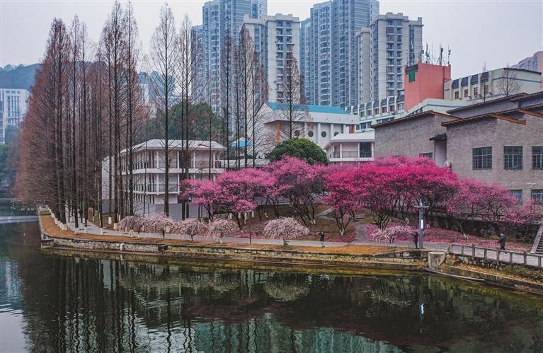 2月21日,吉首大学校园内,风雨湖畔的梅花在春风中悄然绽放,粉白相间的梅花与碧澈的湖水相映成趣,绘出一幅宁静而又生机盎然的春日画卷。微风中轻轻摇曳的梅花,传递着春天到来的讯息,为校园增添了一抹浪漫与诗意。 团结报全媒体记者 胡承鼎 摄