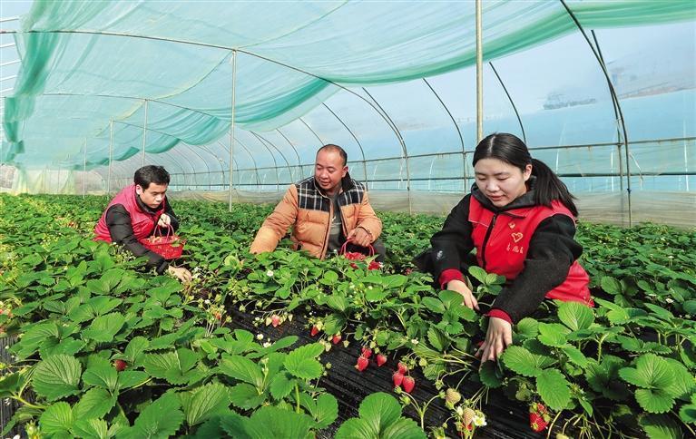 2月25日,花垣县花垣镇兴农园社区草莓种植大棚内,县委组织部干部在帮助果农采收草莓。入春以来,该县组织机关干部走进果园、茶园、菜园等农业生产一线,开展调研和暖心助农活动,通过察农情、干农事、解农忧,助力产业增效和农民持续增收。 龙艾青 摄
