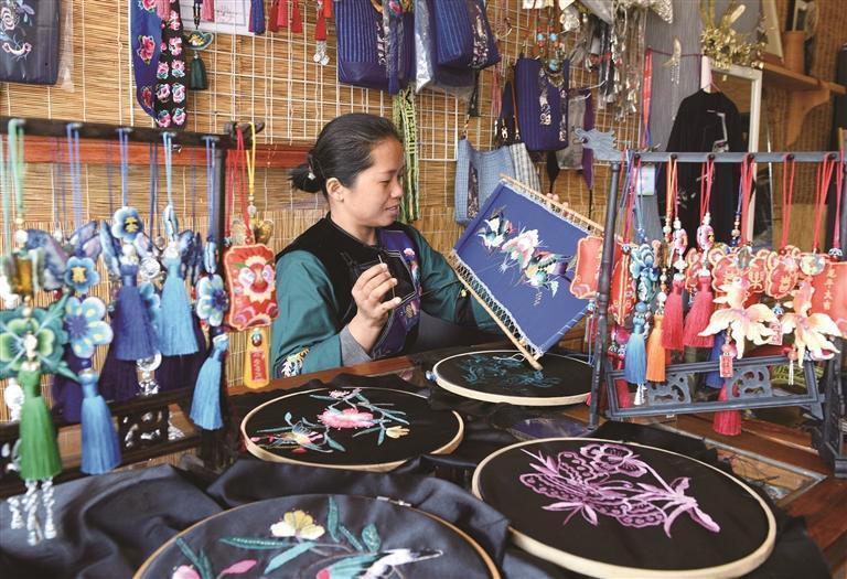 近日,吉首市矮寨镇坪朗村,苗绣非遗传承人正在赶制苗绣产品。该村积极发展苗族刺绣、苗族花带、苗绣手包、苗族服饰等独具特色的文旅产品,通过成立苗绣创新服饰农民专业合作社,传承发扬“指尖技艺”,壮大苗绣文化产业,带动当地妇女在家门口就业。 姚方 杨燕萍 摄