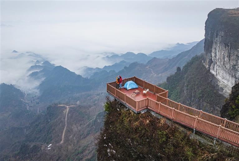 2月27日清晨,龙山县八面山景区,山间云海翻涌如,山顶霞蔚蒸腾。一对游客在缥缈云霭间拼出爱心造型的手势打卡留念,为初春的八面山平添一抹浪漫气息。 团结报全媒体记者 张谨 摄