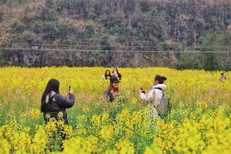 3月16日,吉首市矮寨镇夯腊村,游客在油菜花海中赏花拍照。近日,该村油菜花迎来盛放期,连片的明黄花田与苗寨、峡谷勾勒出诗意春景,吸引不少游人奔赴这场限定的金色邀约。 彭璟 摄