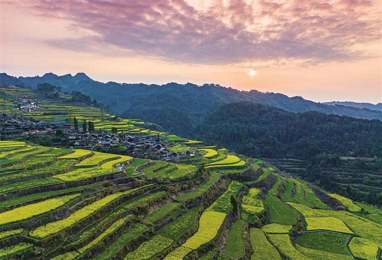 3月22日,2025年古丈·岩排溪第二届梯田油菜花旅游季主题活动启幕。游客在千亩油菜花交织而成的金色海洋里游玩打卡,油菜花梯田与传统村落相互映衬,绘成一幅春日画卷。 团结报全媒体记者 张谨 摄