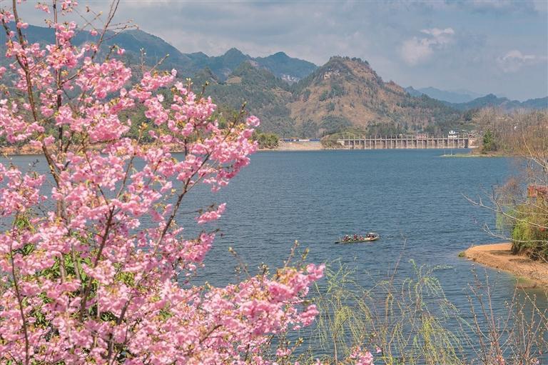 近日,古丈县栖凤湖,风和日丽,樱花盛放,湖水荡漾,游人碧波泛舟,享受如画春光。 梁永鸿 摄