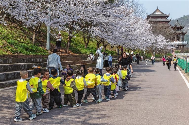 3月25日,泸溪县武溪镇白沙沅江大道春风轻拂,绿柳摇曳,粉白烂漫的樱花肆意绽放。市民和孩子们纷纷来到沅水江畔踏春赏花,拍照打卡“氧吧之城”,领略十里樱花十里画的春天气息。 张克宁 摄