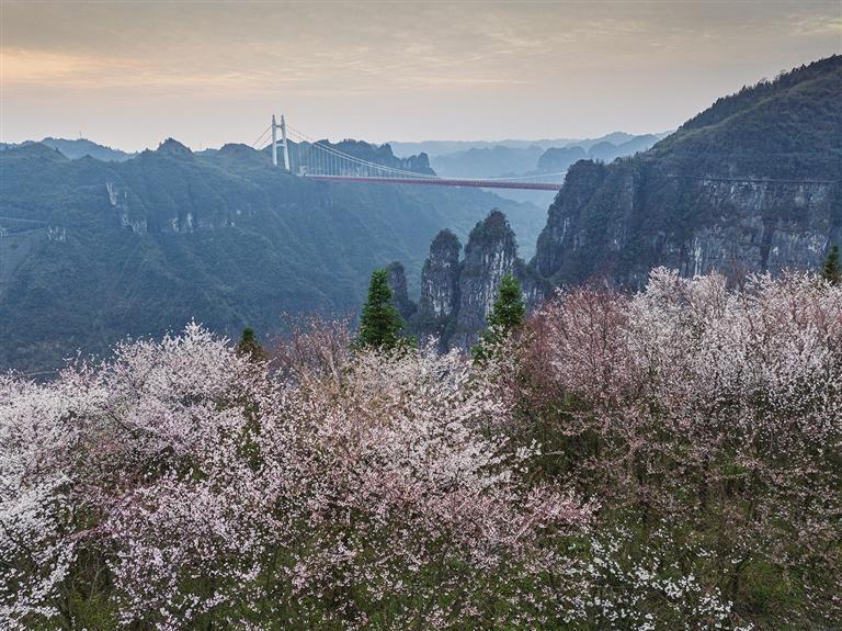 春分过后,湘西大地迎来盎然生机。矮寨大峡谷一处樱花园里,如云似雪的樱花缀满枝头,与远处凌空飞架的矮寨大桥构成壮美画卷,盛放自然的诗章。 团结报全媒体记者 张谨 摄