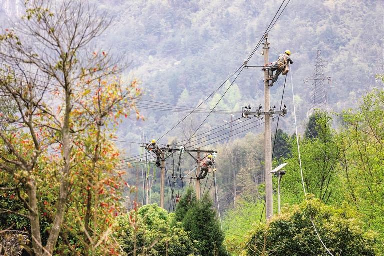 3月29日,吉首市矮寨镇坪朗村,国网湘西矮寨供电所员工在进行10千伏矮阳线综合治理施工。电力人员通过更换绝缘线、防雷限压器等措施,消除线路安全隐患,提高线路抗灾害能力,有效提升雷雨季节供电可靠性,确保苗寨村民安全稳定用电,为乡村振兴注入强劲电能保障。 彭璟 田赟 摄