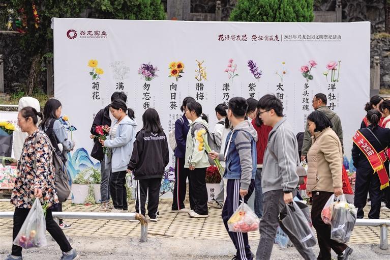 4月4日,吉首市兴龙陵园内,市民手持鲜花、轻执笔墨,以绿色文明的方式追思故人。清明节期间,陵园推出“鲜花换纸钱”“家书寄哀思”等便民服务,倡导无烟祭扫理念,让传统习俗与现代文明融合,让绿色殡葬理念浸润人心。 团结报全媒体记者 杨帆 摄