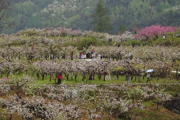4月6日,花垣县花垣镇下寨河村和窝勺社区的金秋梨种植基地,百亩梨花竞相绽放,美不胜收,吸引众多游客踏春赏花。 团结报全媒体记者 李再兴 摄