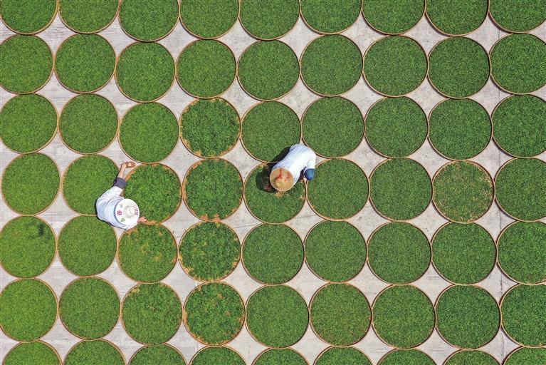4月10日,龙山县茅坪乡茶园坪村一茶叶加工企业,工人正在翻晒春茶嫩芽。眼下正是采摘春茶的最佳时期,该县茶农抢抓农时采摘茶叶嫩芽,加工新茶供应市场,增加收入。 曾祥辉 摄